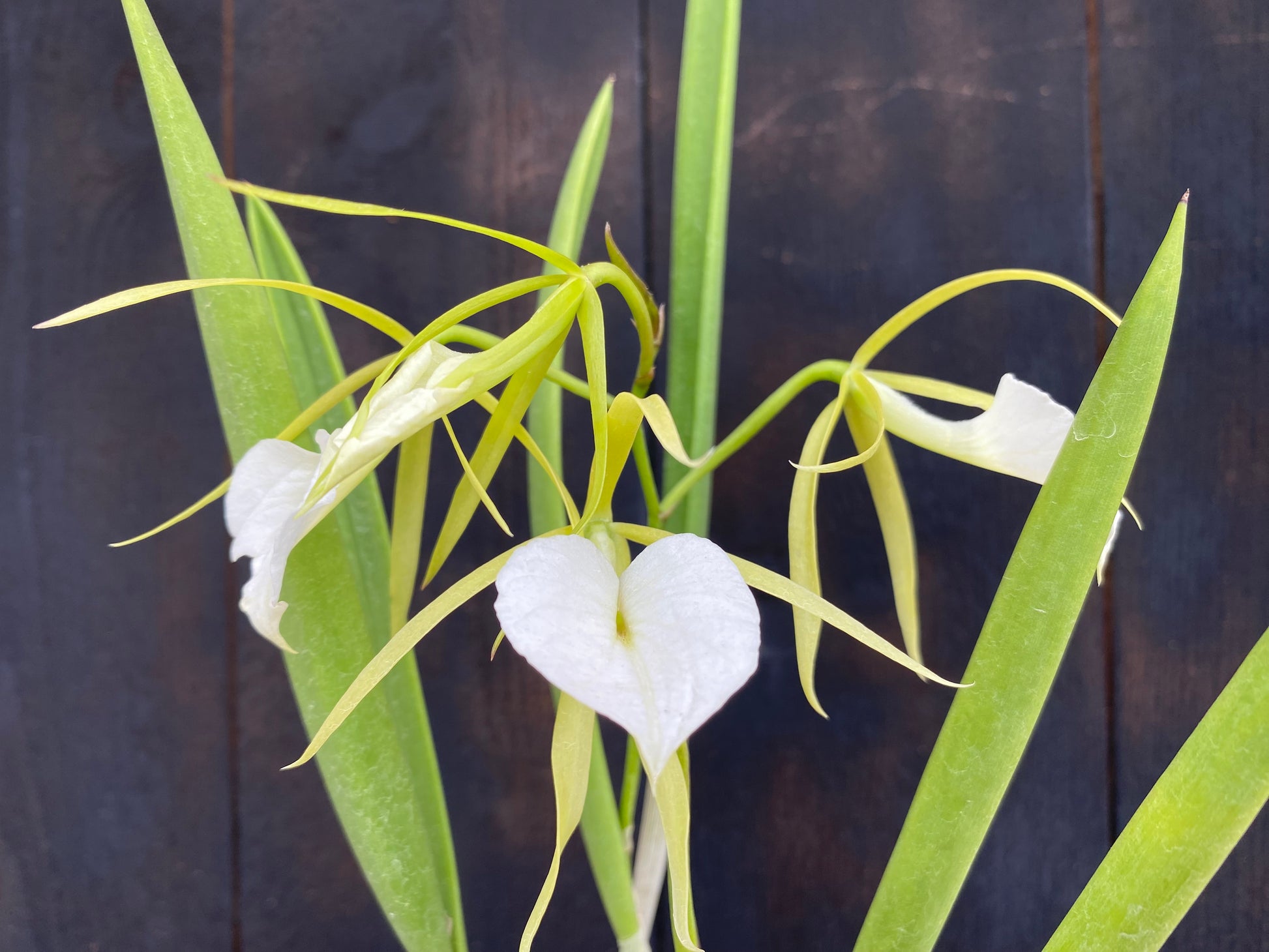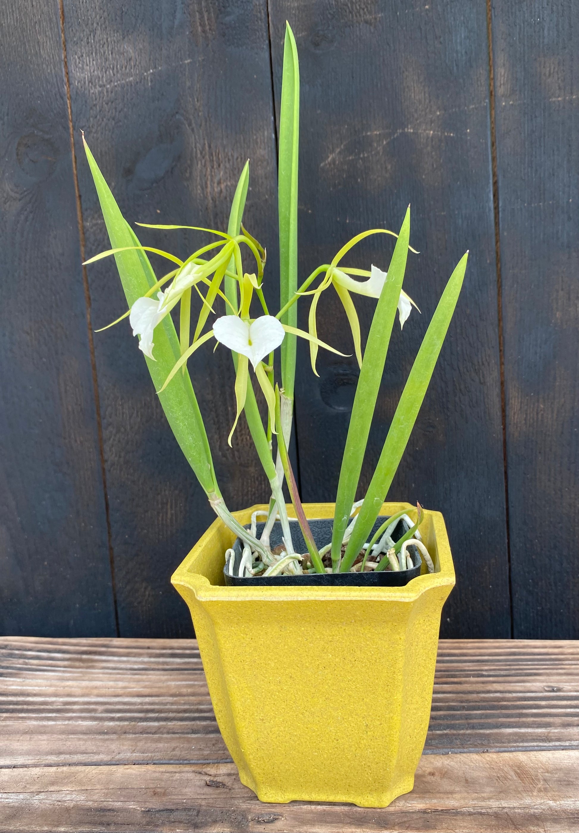 If the moon had a favorite flower, this would be it. Brassavola 'Little Stars' is famous for its otherworldly blooms and, more importantly, its intoxicating nocturnal perfume. By day, the flowers are elegant, spidery constellations. Long, slender, whip-like sepals and petals of a cool chartreuse-green radiate outwards. Front and center is a large, perfectly heart-shaped lip of the purest, most immaculate white, looking like it was cut from pristine velvet. The whole plant has a unique, architectural look with succulent, pencil-like leaves (botanically known as terete foliage) that are a testament to its hardy nature. But the real magic happens after dusk. As night falls, the flowers release a powerful, sweet, citrus-and-jasmine fragrance that can fill an entire room. It’s the official perfume of the moon.
