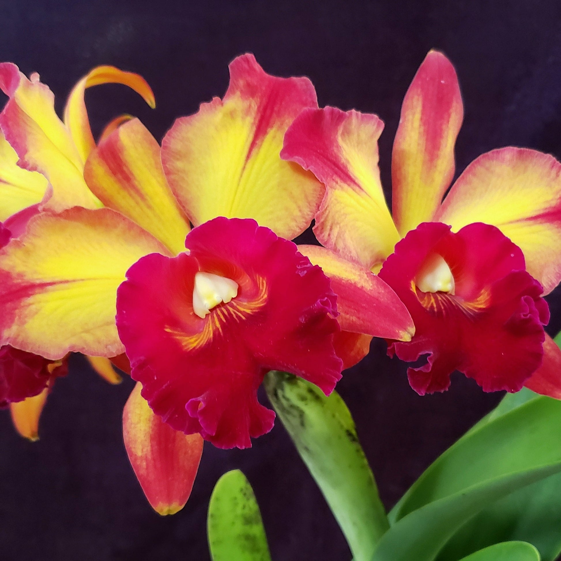With yellow flowers accented by red hues, this classic Cattleya is a work of art. Carefully cultivated and hybridized by a local breeder, Blc. Toshie Aoki 'Pizazz' is one of many examples of Hawaii's floricultural excellence. This orchid will thrive in bright indirect light, warm to hot temperatures, and is best left to dry between waterings. Grown in Hawaii in 4" pots, these are available as blooming size only, no buds or spikes.
