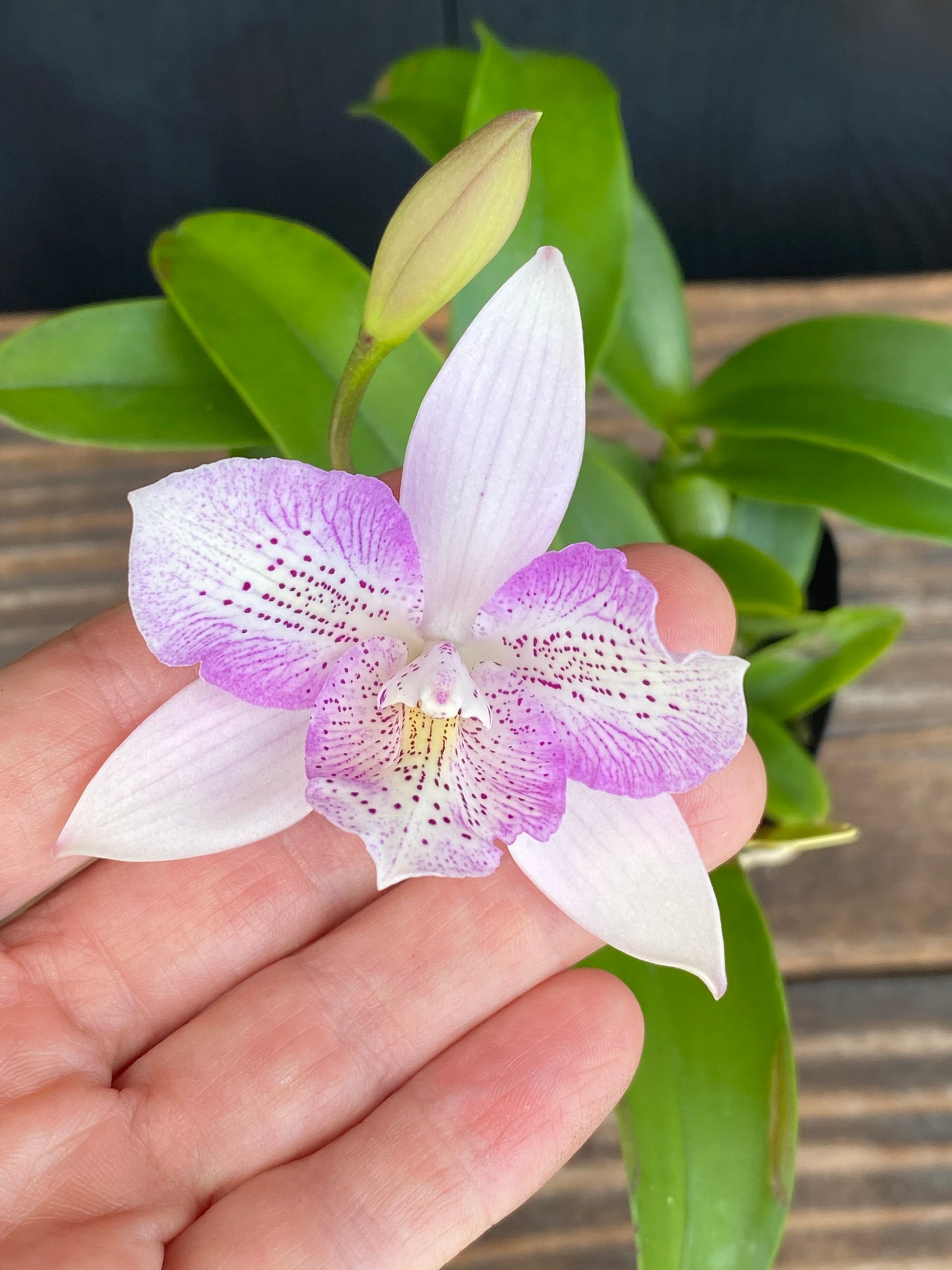 When you cross these two, you get Caulocattleya Chantilly Lace. The 'Twinkle' cultivar captures the best of this pairing. The flowers inherit that wonderful crystalline texture from the Caularthron, giving them a sparkling, sugary appearance in the light. The color is a delicate blend—a base of white to blush pink with subtle flares of darker pink on the petals, a ghost of the 'Splash' parent. The lip is where you see the most color, usually with a bright yellow throat and magenta markings. The flowers are star-shaped, about 3-4 in. across, and held in beautiful clusters. And yes, it thankfully inherited the wonderful, sweet fragrance from its Cattleya parent.