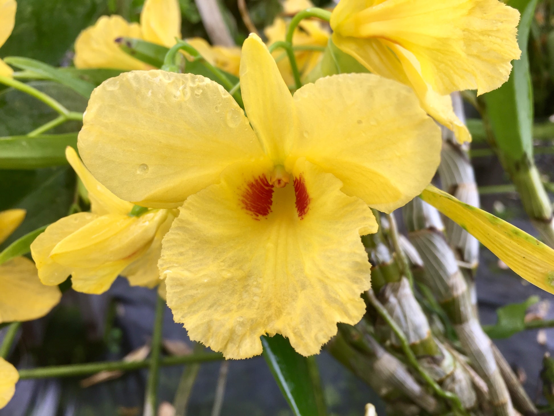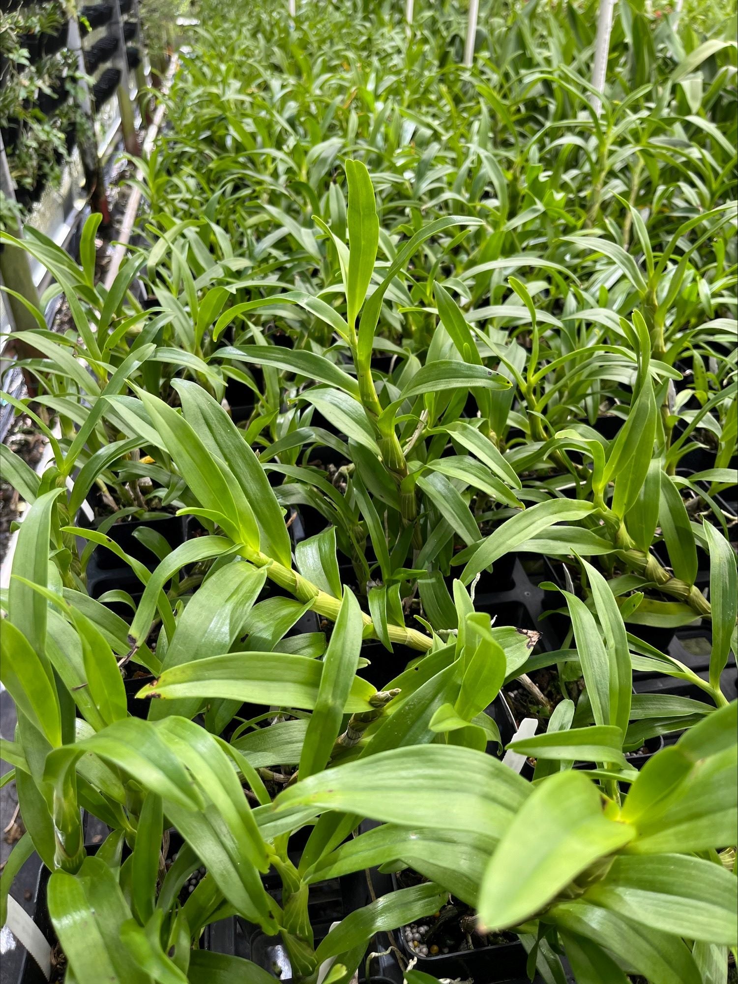 This is a sympodial orchid with upright, cane-like pseudobulbs that can reach about 12-18 in. tall. The canes are segmented, and along these segments grow thin, lance-shaped leaves during the spring and summer growing season. Come fall, the plant begins its transition to dormancy; the leaves will yellow and drop from the mature canes. Don't panic, this is completely normal! This signals the plant is ready for its cool, dry winter rest. Following this rest, clusters of two to three waxy, long-lasting flowers, each about 2-3 in. across, erupt directly from the nodes along the now leafless canes. It’s a spectacular sight to see these bare stems burst into brilliant color.
