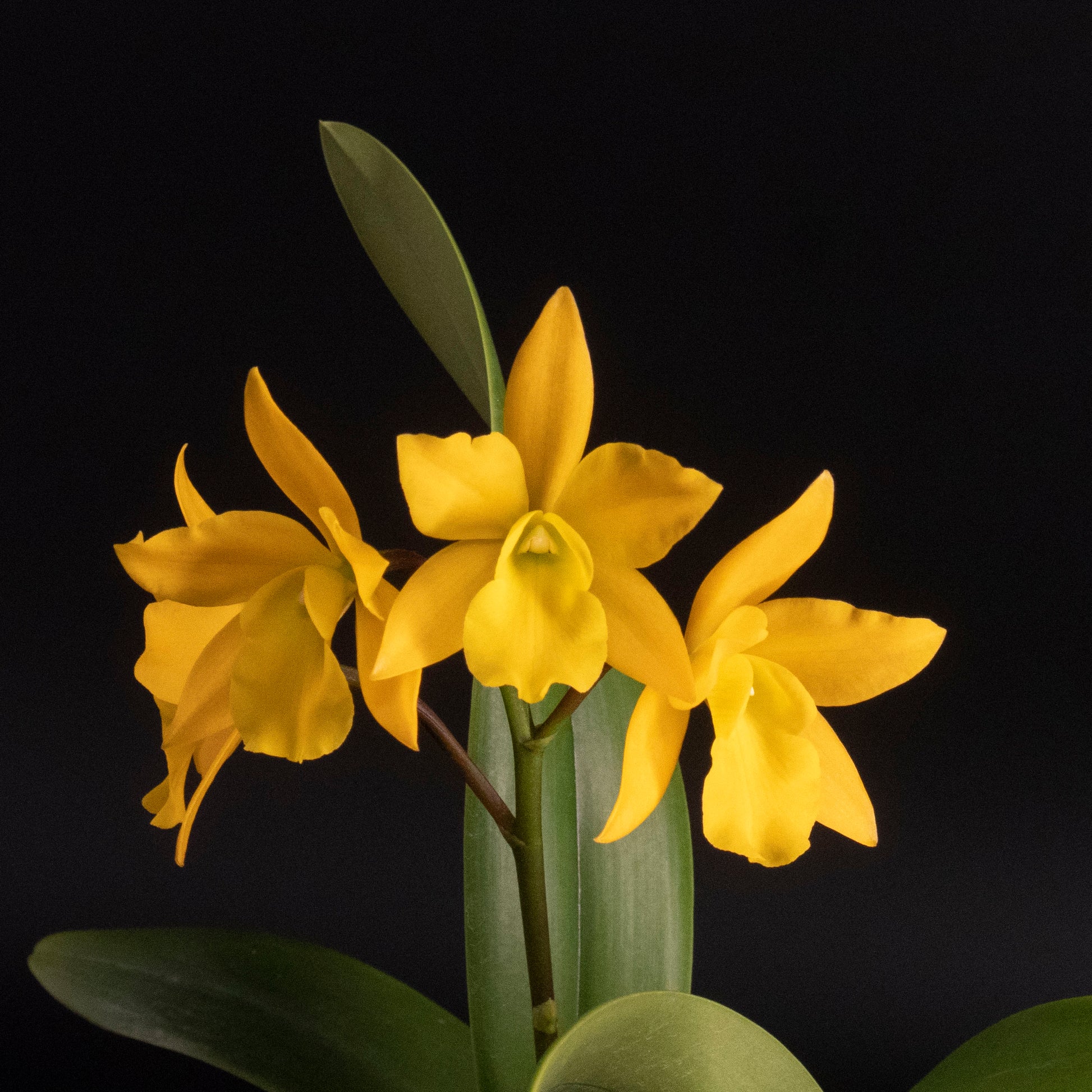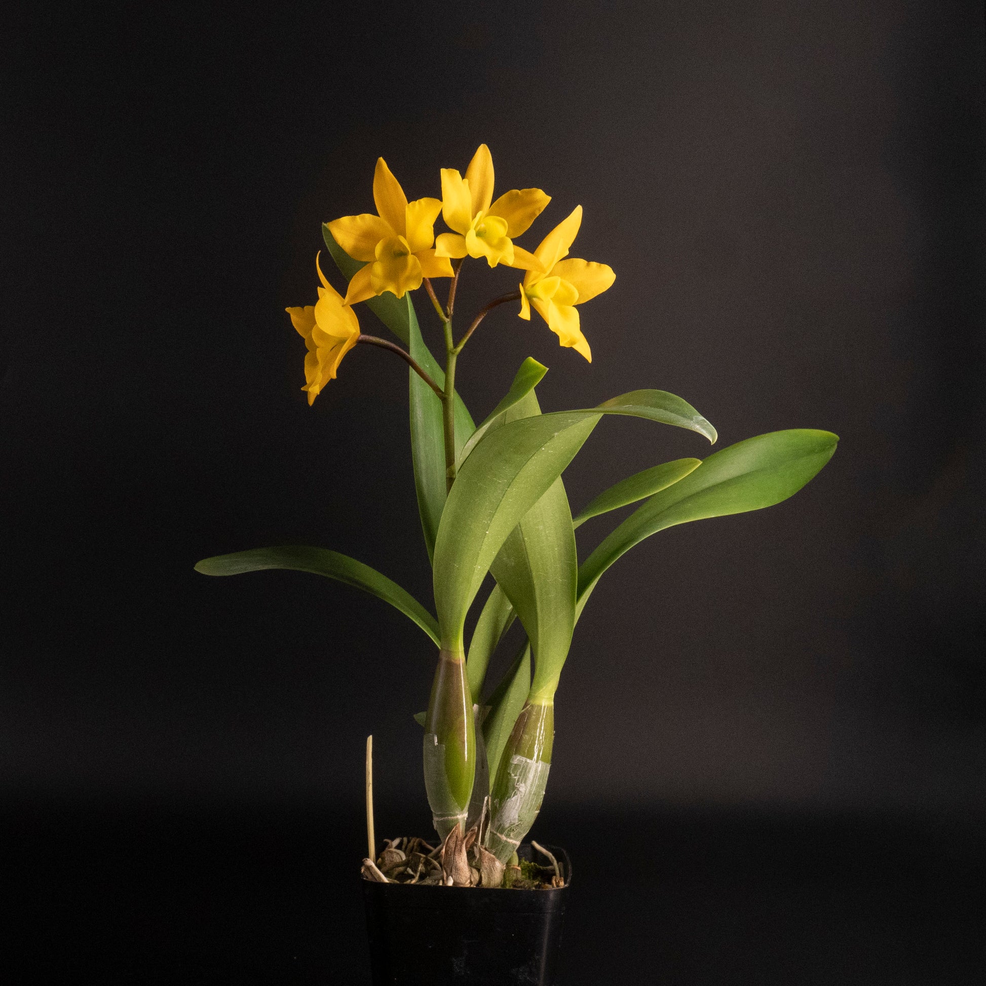 This sunny Cattleya hybrid is another local creation, and features incredible colors with a bright, sweet citrus scent. It grows well in warm temperatures and bright light, but can tolerate cooler temperatures and lower light than its wild cousins. Let it dry out between waterings and enjoy its flowers for years to come!