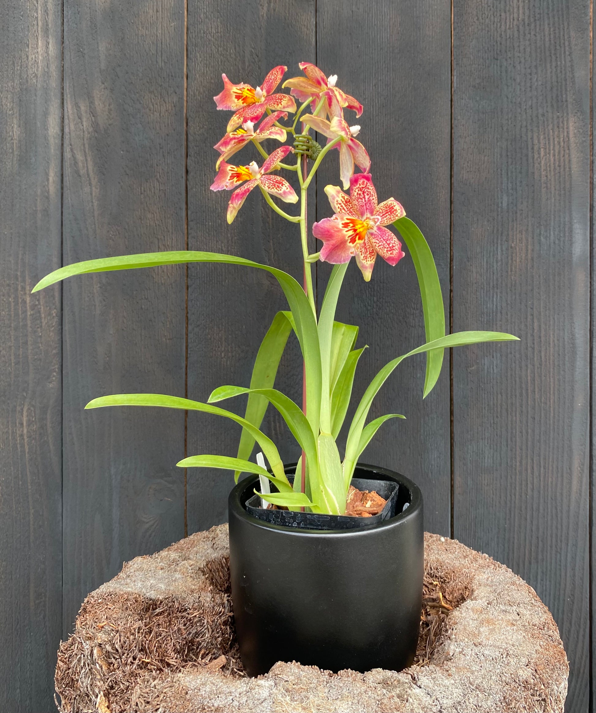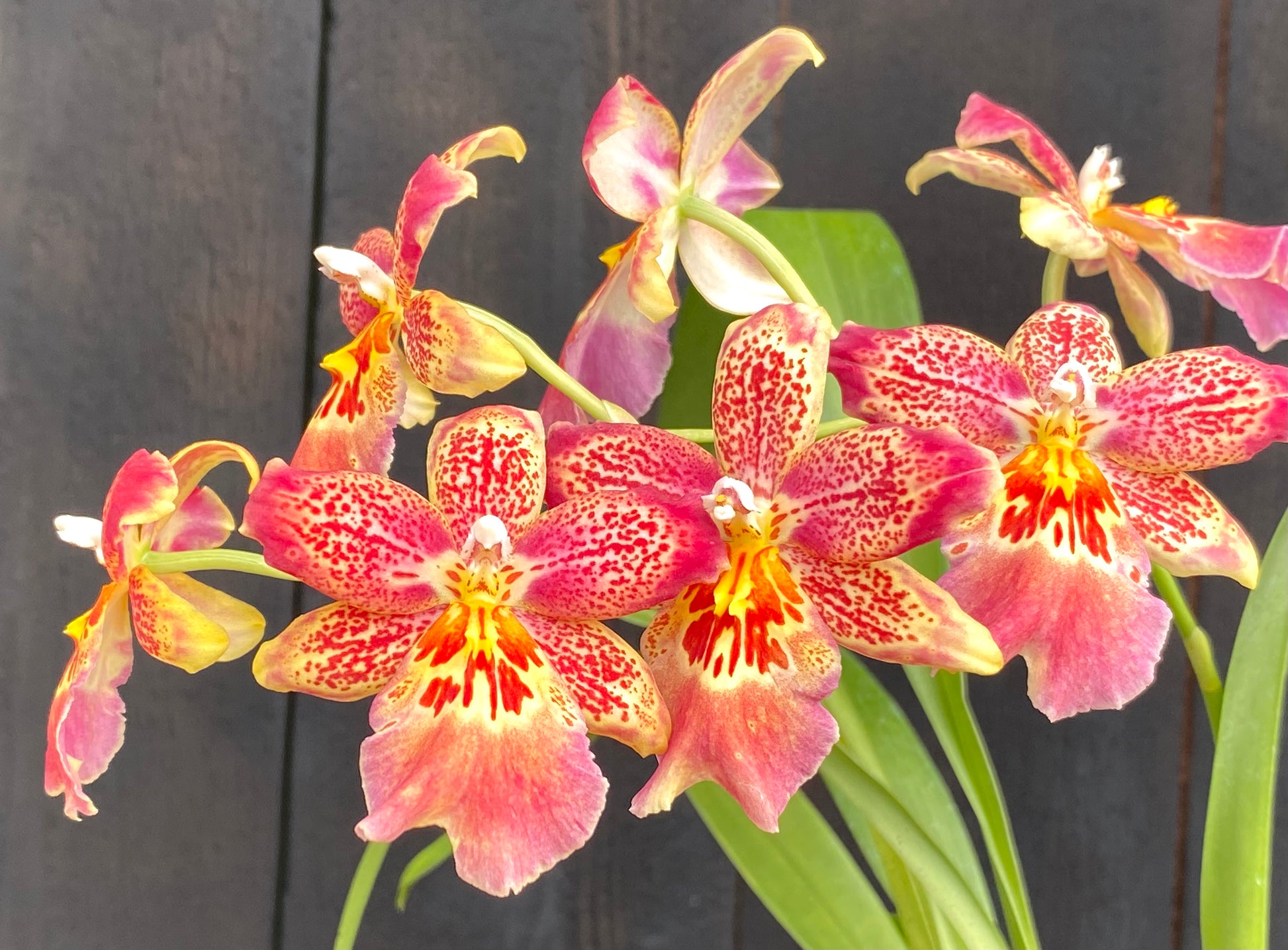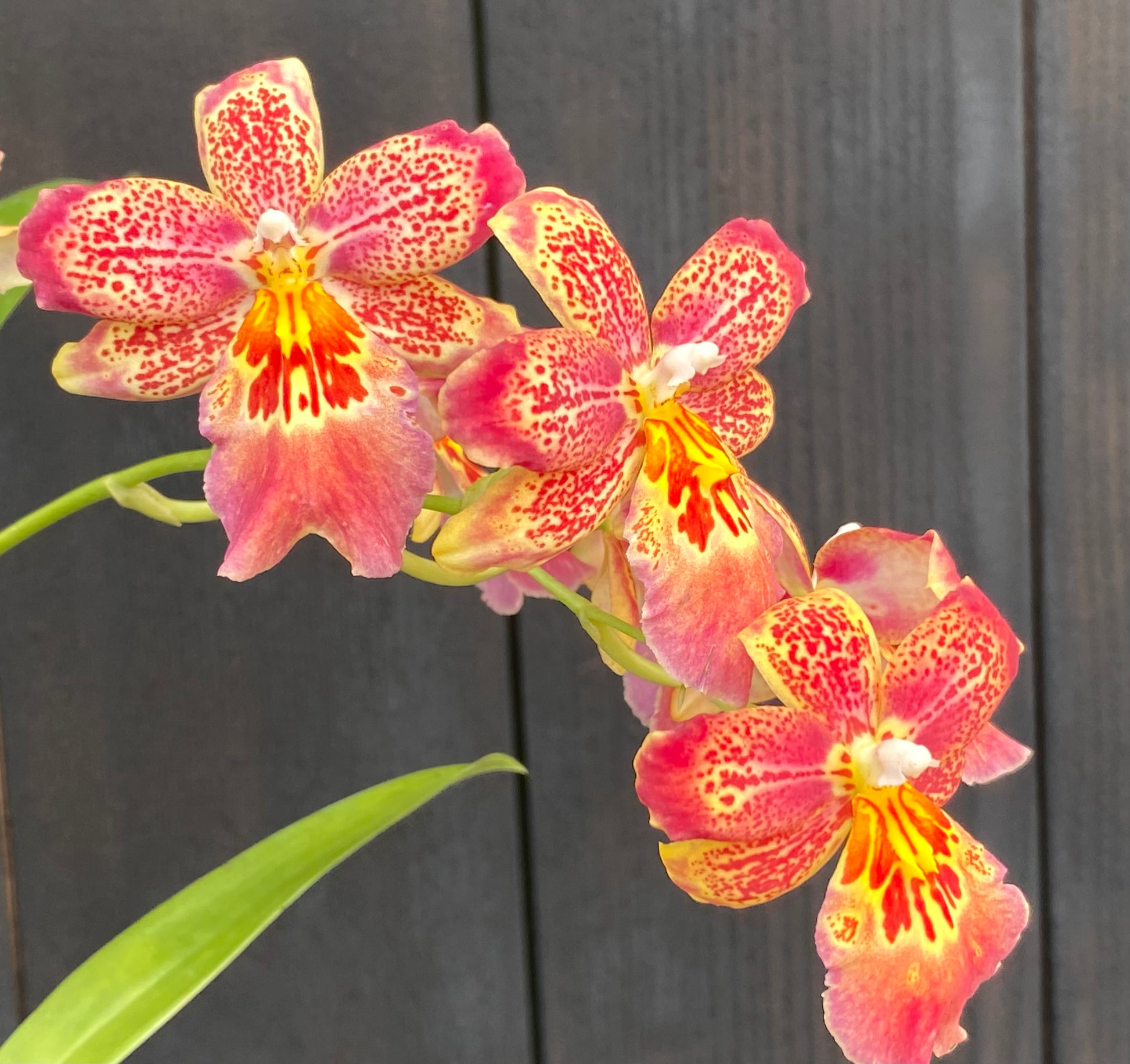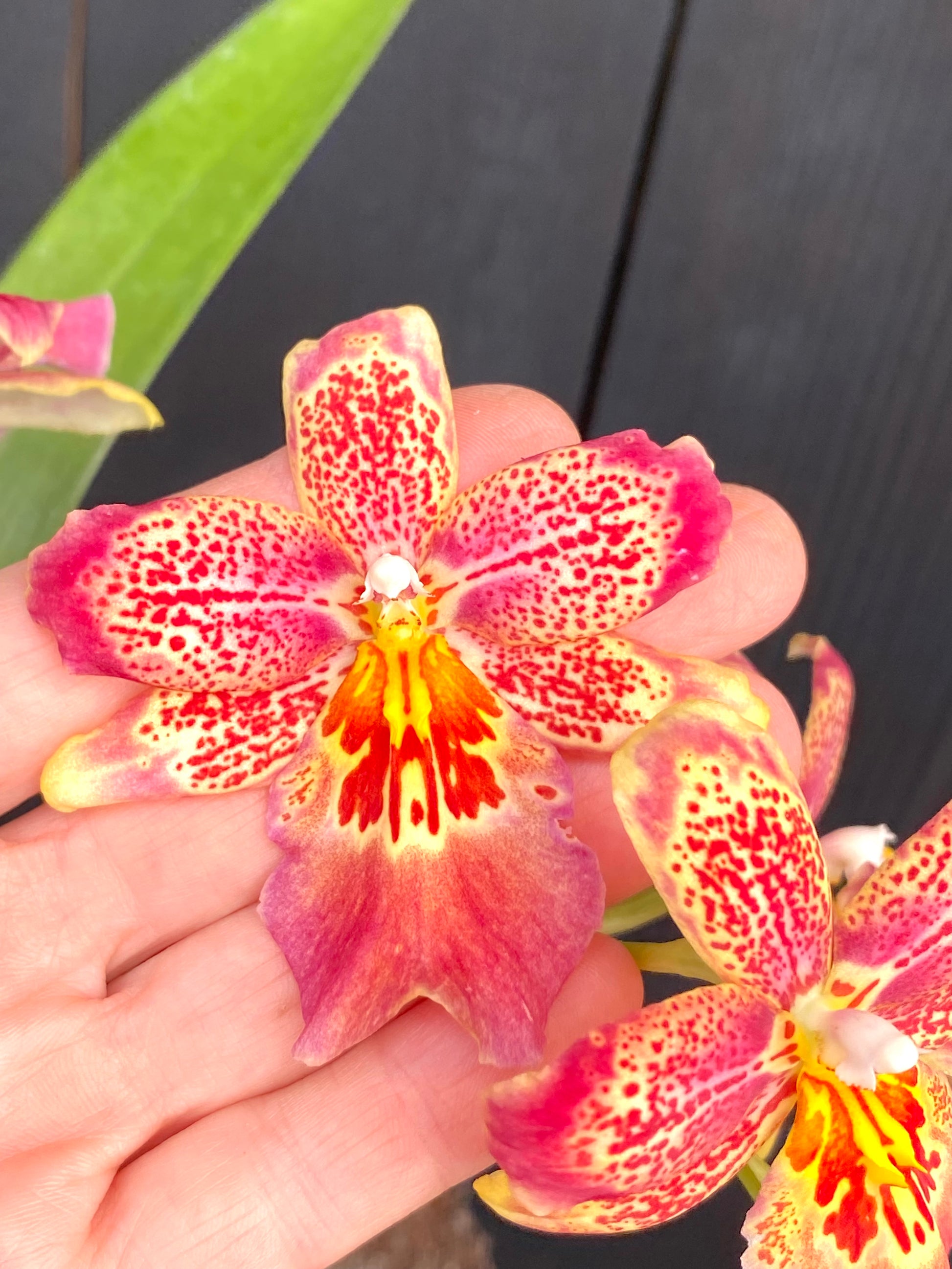 This plant is an Oncidopsis, a hybrid genus created by crossing Miltoniopsis (the "pansy orchid") with Oncidium. This specific cross takes Oip. Celtic Sun and combines it with Oip. Burgundian. When we look at the family tree, one name appears on both sides: Miltoniopsis vexillaria. This famous "pansy orchid" from the cool, misty cloud forests of Colombia and Ecuador, found at elevations of 4,000-7,000 ft., contributes its signature large, flat, and open-faced flower shape. The other major influence comes from high-elevation Oncidium species like Onc. schroederianum, which brings complex color patterns and ruffles to the mix.