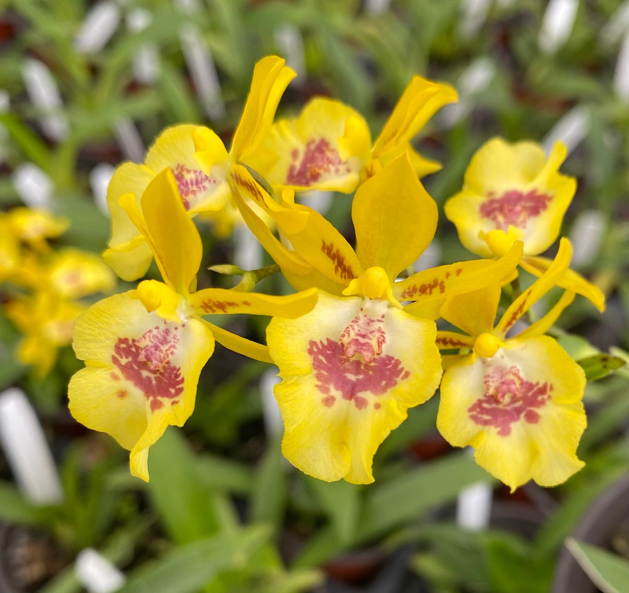 Oncsa. Hwuluduen Chameleon (Onc. Pupukea Sunset X Gom. echinata). 3" pots. Beginning to spike.