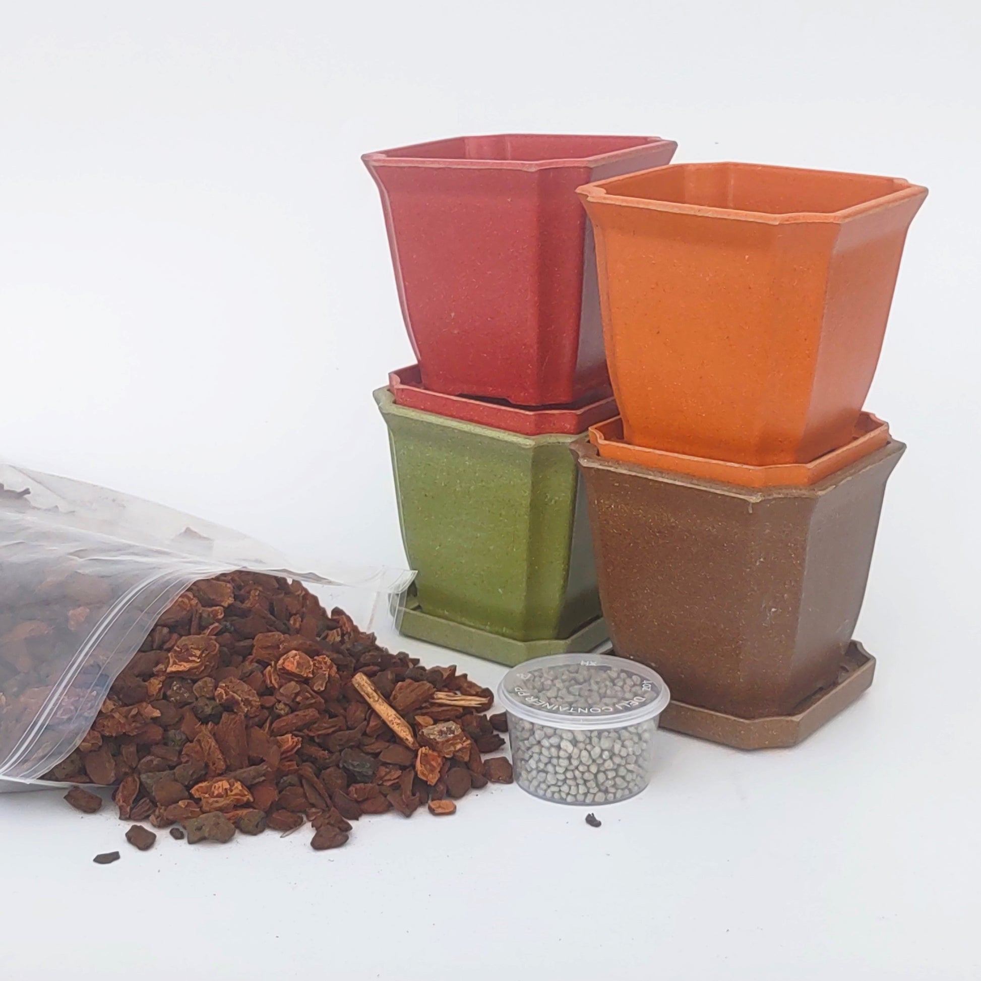 Includes 4 qt bag of orchid potting media, 4 eco pots, and a 4 oz container of orchid fertilizer.