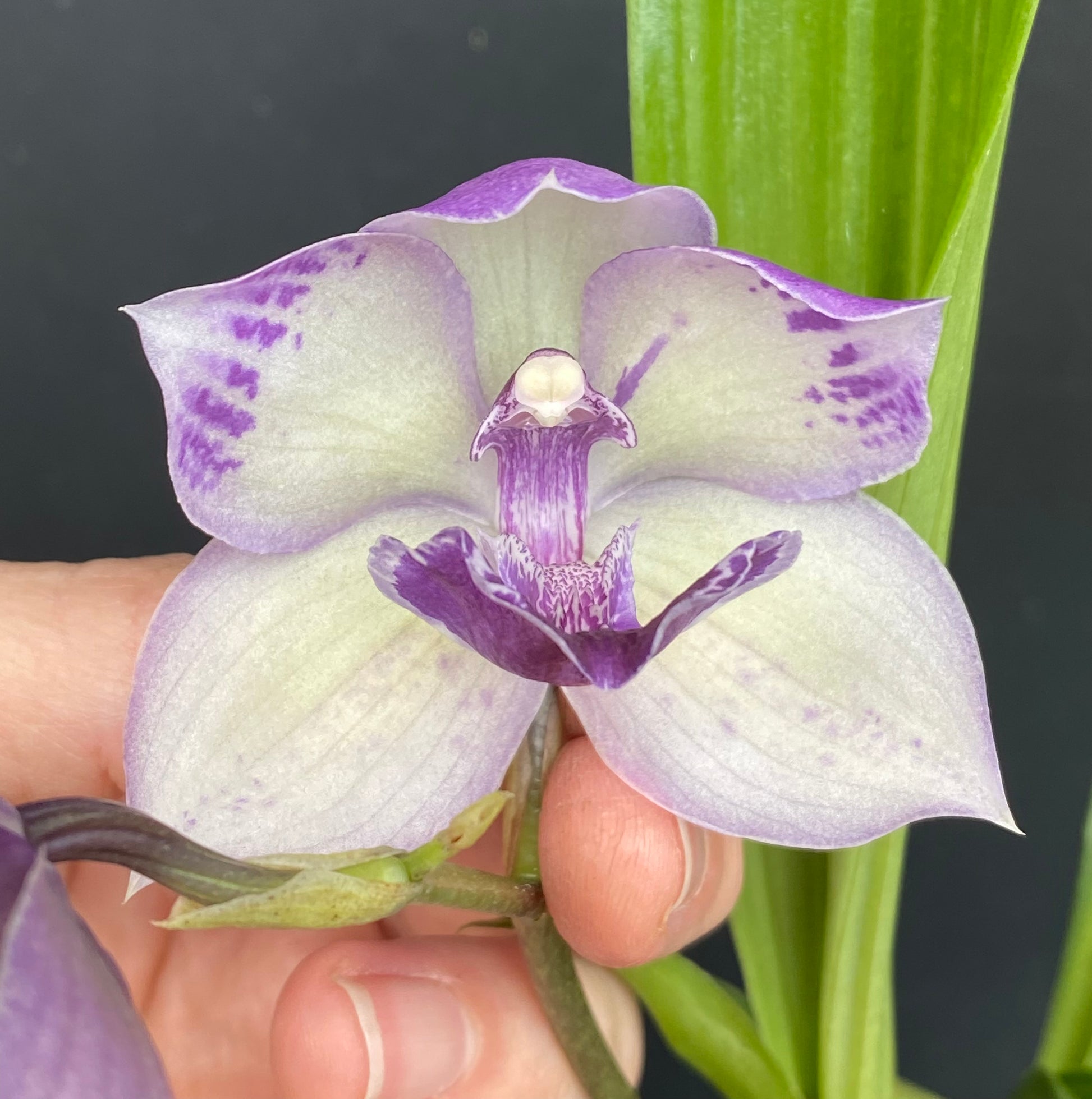Tsubotaara (Tst.) Melinda Marie 'Blue Fairy' A lovely intergeneric cross between Pbn. Eva's Blue Amazon and Zns. Cynosure, Melinda Marie 'Blue Fairy' is sure to delight! Considered a mini as foliage grows just 10-12" tall. The flowers are white with bluish-purple highlights and an indigo lip, and offer a subtle, fresh fragrance. Blooms are about three inches across and last for about one month. Some of our current budding stock have two flower spikes! Grown in a 4" pot.