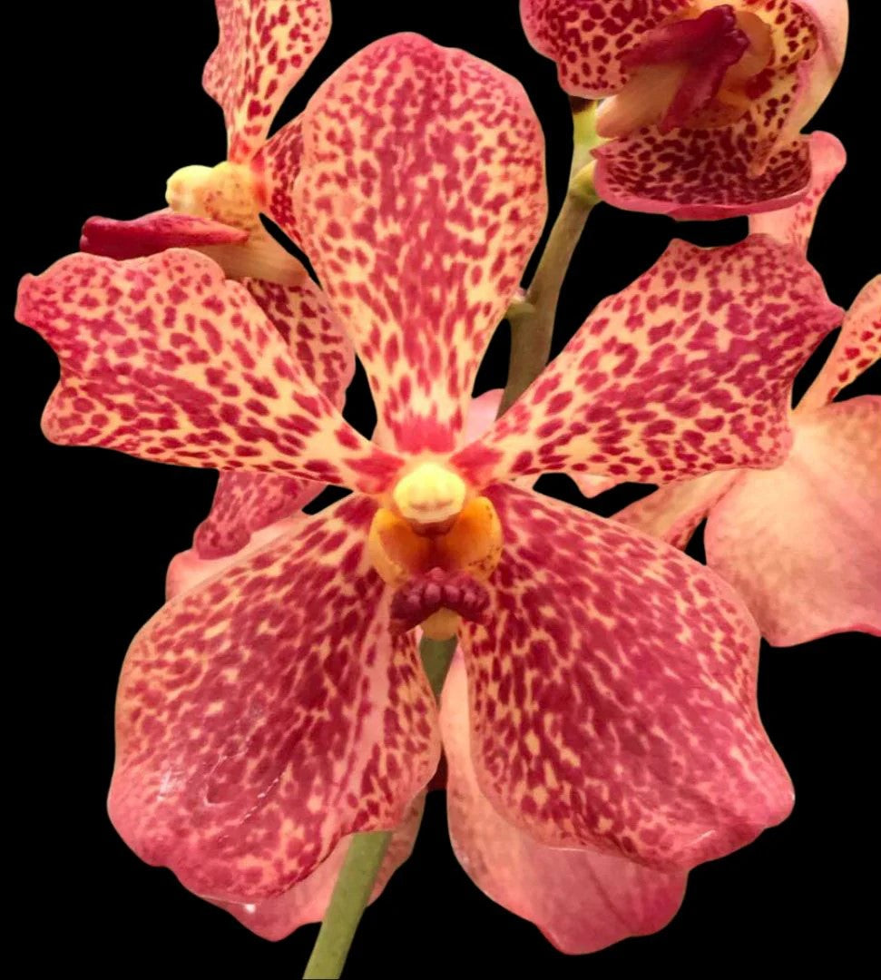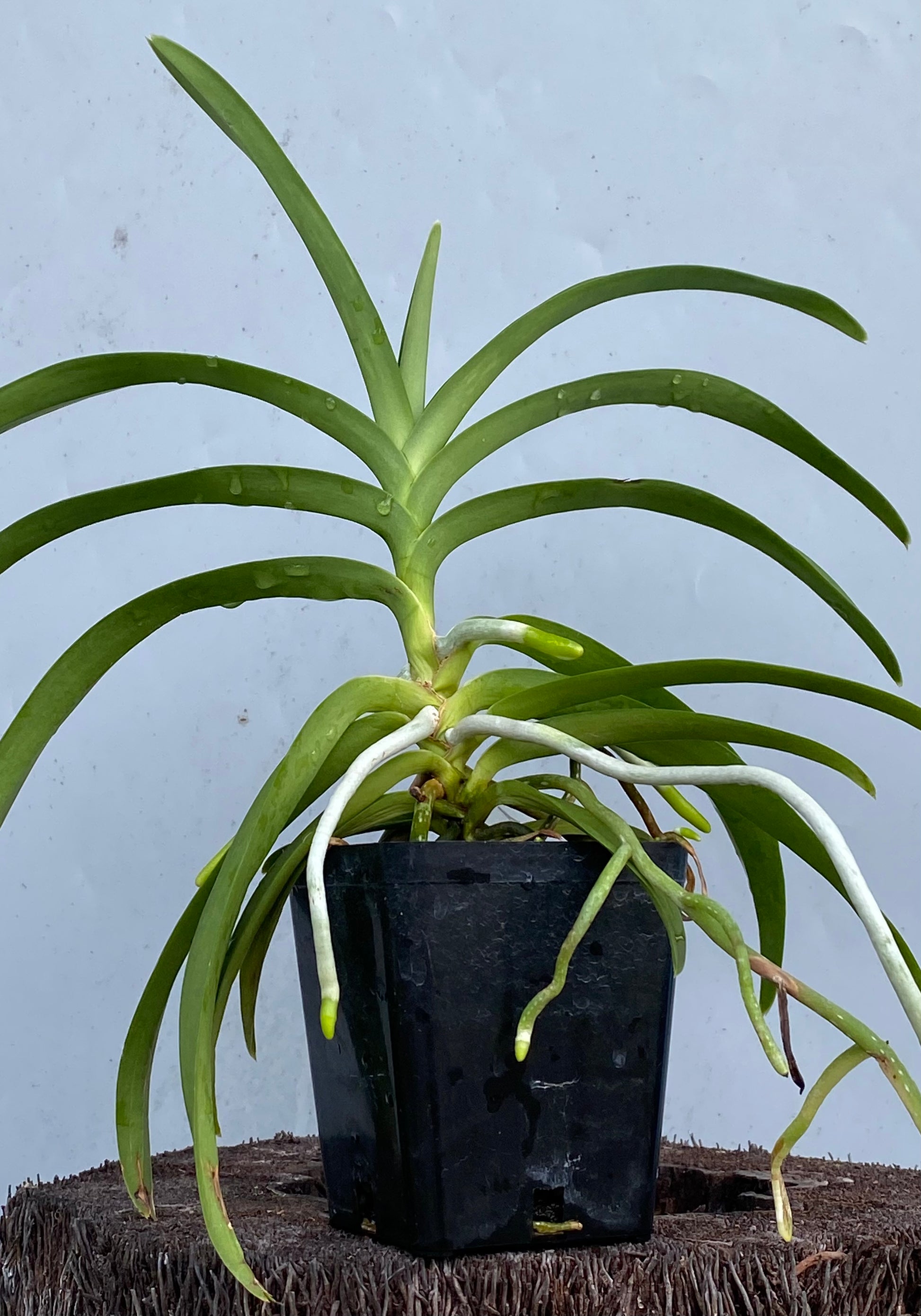 A Vanda Alliance orchid, Native to tropical Asia. Vandas prefer high humidity and produce large, fleshy roots to store moisture during intermittent dry phases. The Mokara Sayan x Dr. Anek produces reddish-orange spotted flowers with a very small red lip. With proper care, vandas may produce blooms several times a year offering vibrant and colorful displays. Currently offered in blooming size showing robust root growth.