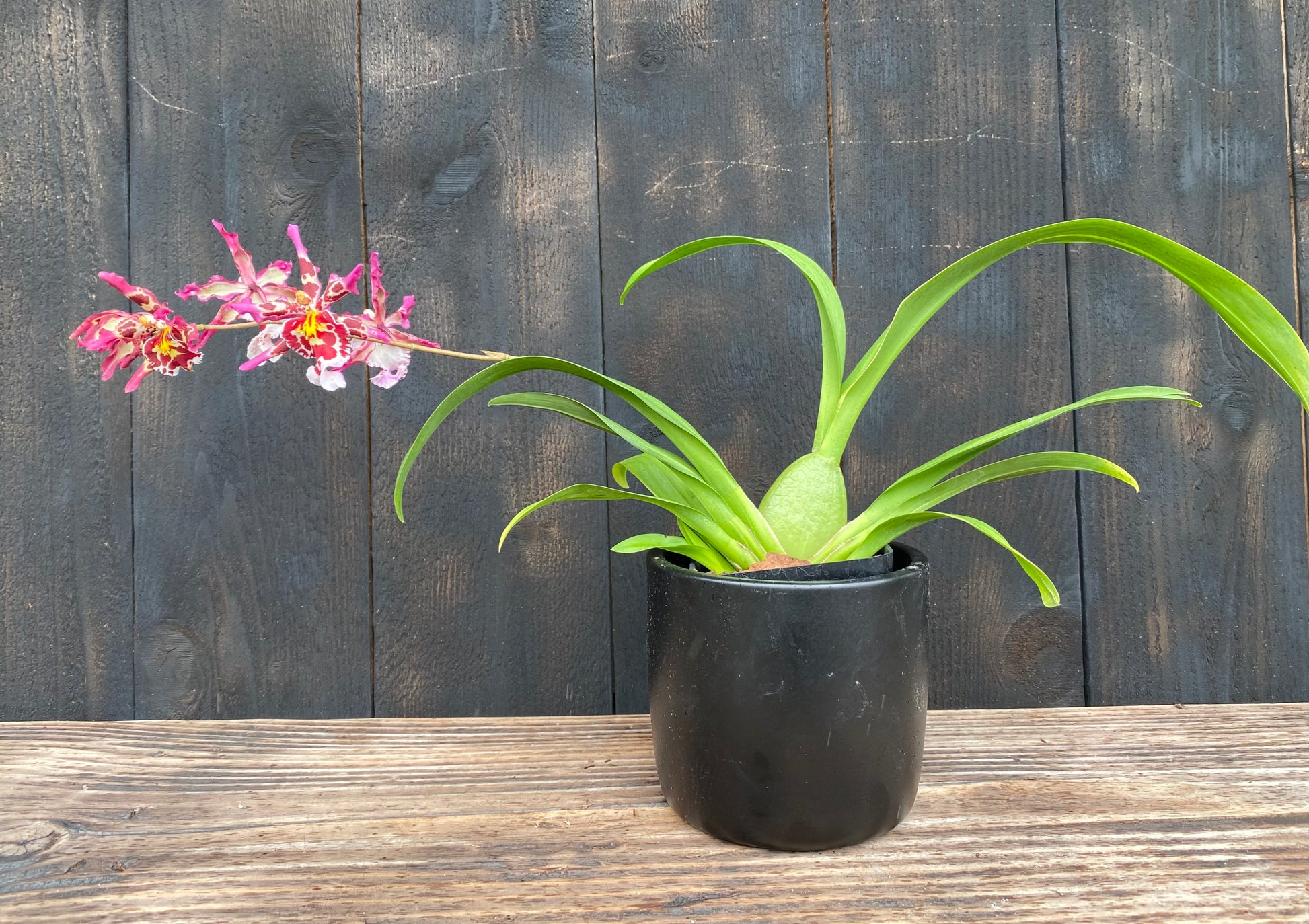 Water These plants have plump pseudobulbs to store water, but their fine roots dislike drying out completely. Water thoroughly, drenching the pot, and then wait until the medium is just approaching dryness before watering again. Never let it sit in a saucer of water.